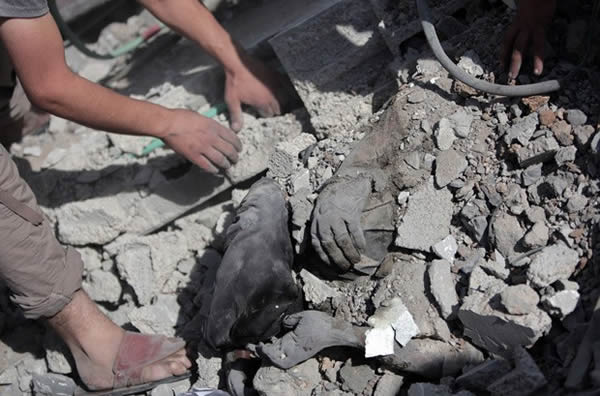 Durante trégua de 12 horas na Faixa de Gaza, neste sábado (26), palestinos tentam resgatar corpo dos escombros de uma casa destruída (Foto: AP Photo/Khalil Hamra)
