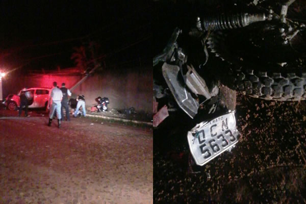 Carro derrubou o poste e a moto, também, fico bastante estragada. (Foto: Agência Miséria)