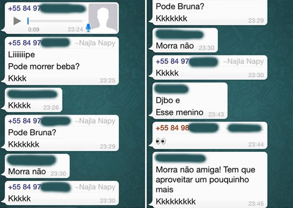 A estudante de Direito Najla Charara, de 21 anos, que morreu após bater o carro em um poste na madrugada desta quinta-feira (12), em Natal, conversava com amigos em um grupo do WhatsApp – pouco antes do acidente – sobre morrer "beba". Às 23h25 ela escreveu: "Lipeeee. Pode morrer beba? kkkk" (sic).