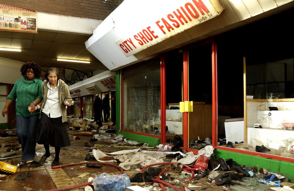 Dona de loja de sapatos é ajudada por uma das funcionárias enquanto verifica os danos causados por manifestantes xenófobos em onda de violência contra imigrantes na África do Sul Foto: Themba Hadebe/AP Photo